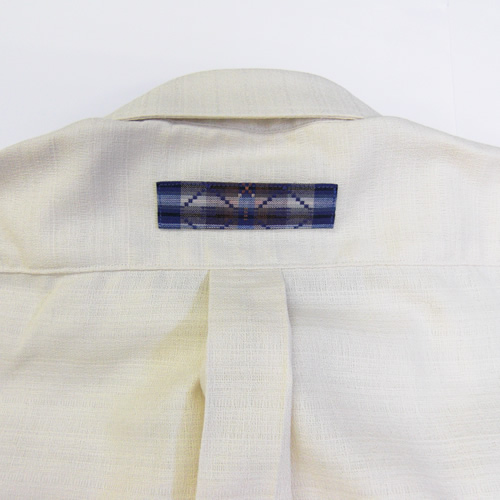 沖縄の空や海のような色使いの花織が涼しげです。背中や腕にもポイントがあり、木のボタンを使うなど、細かい部分にも拘ったデザインです。